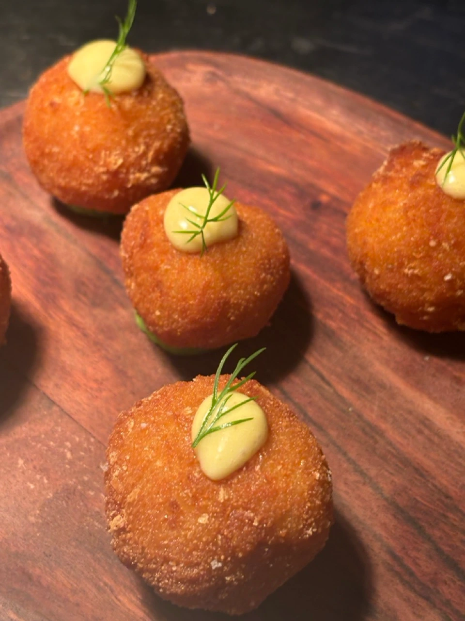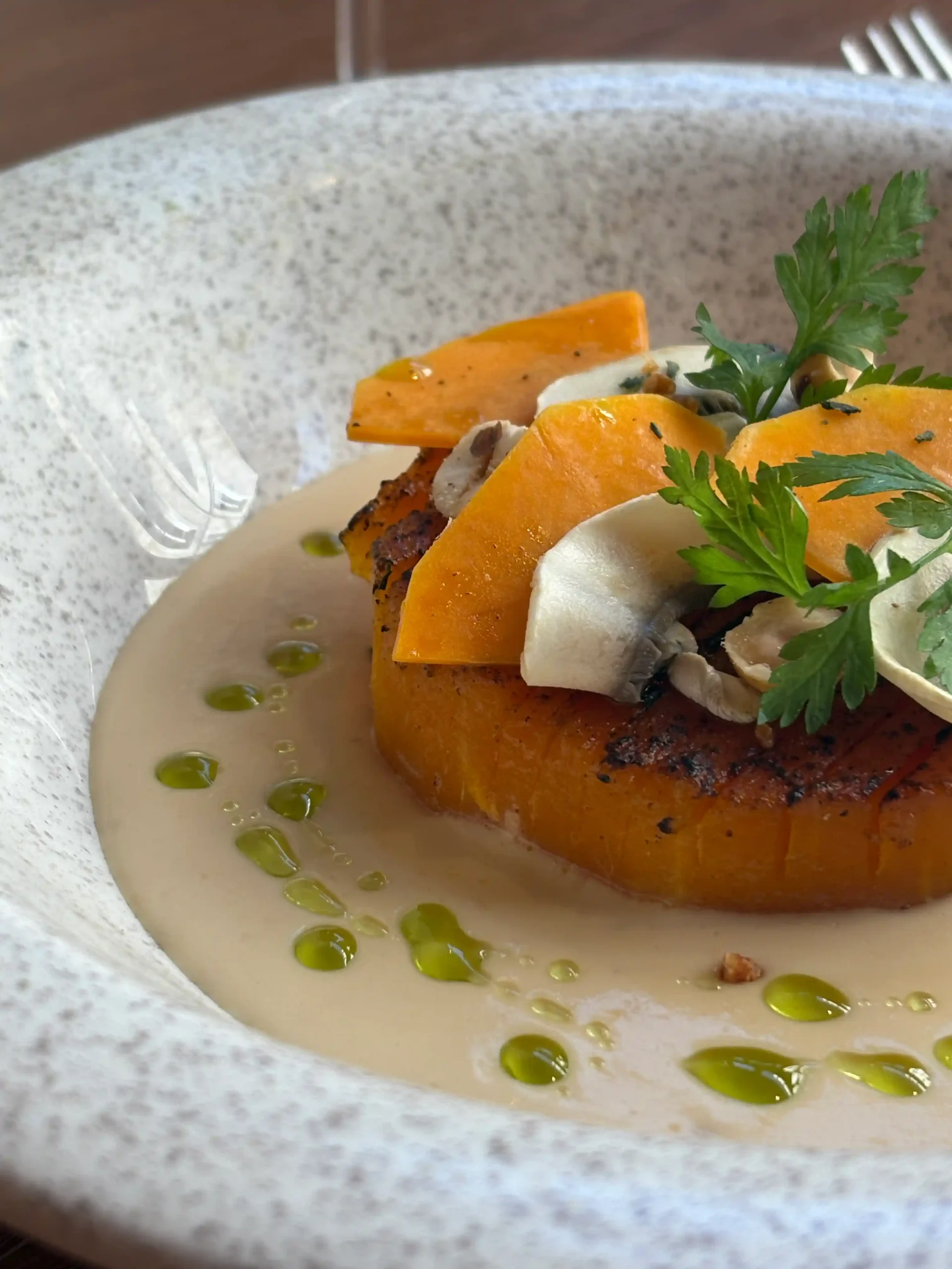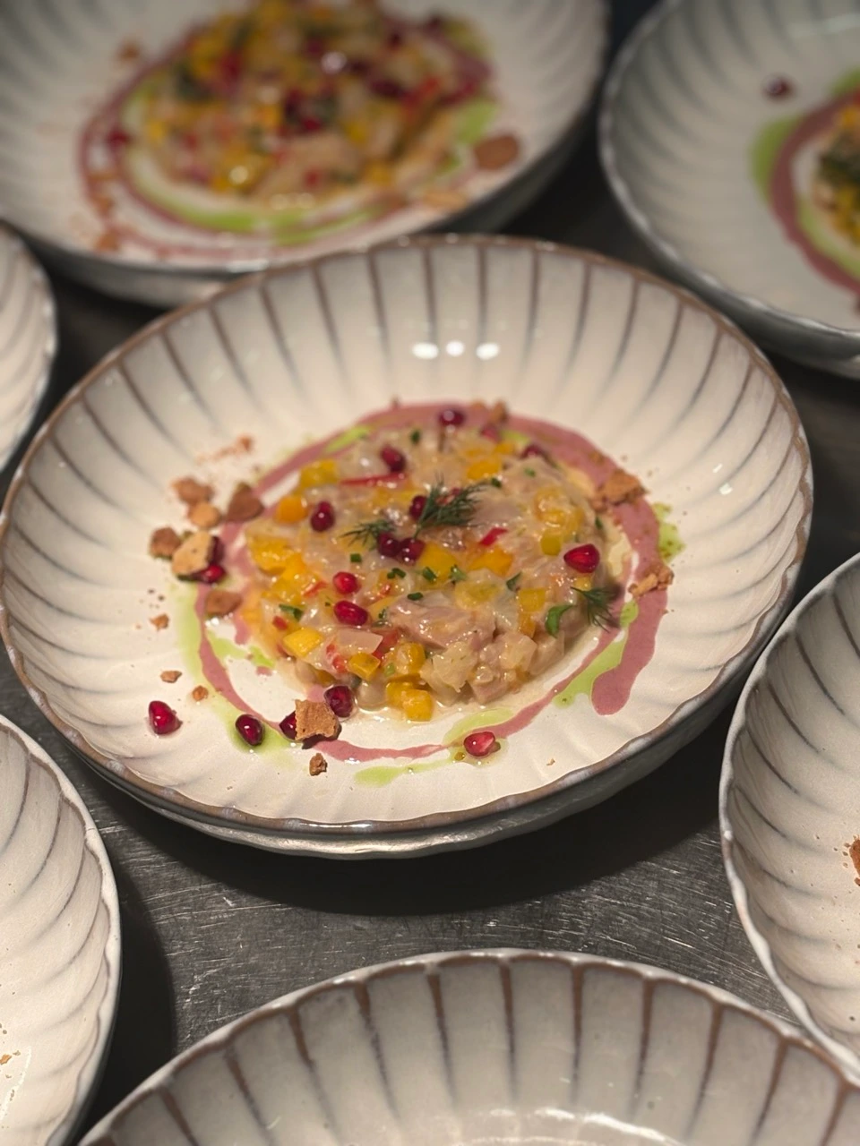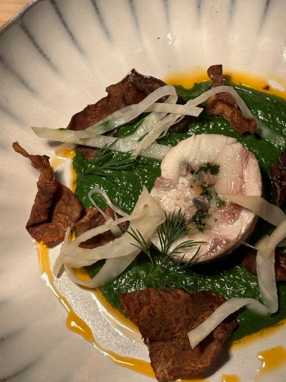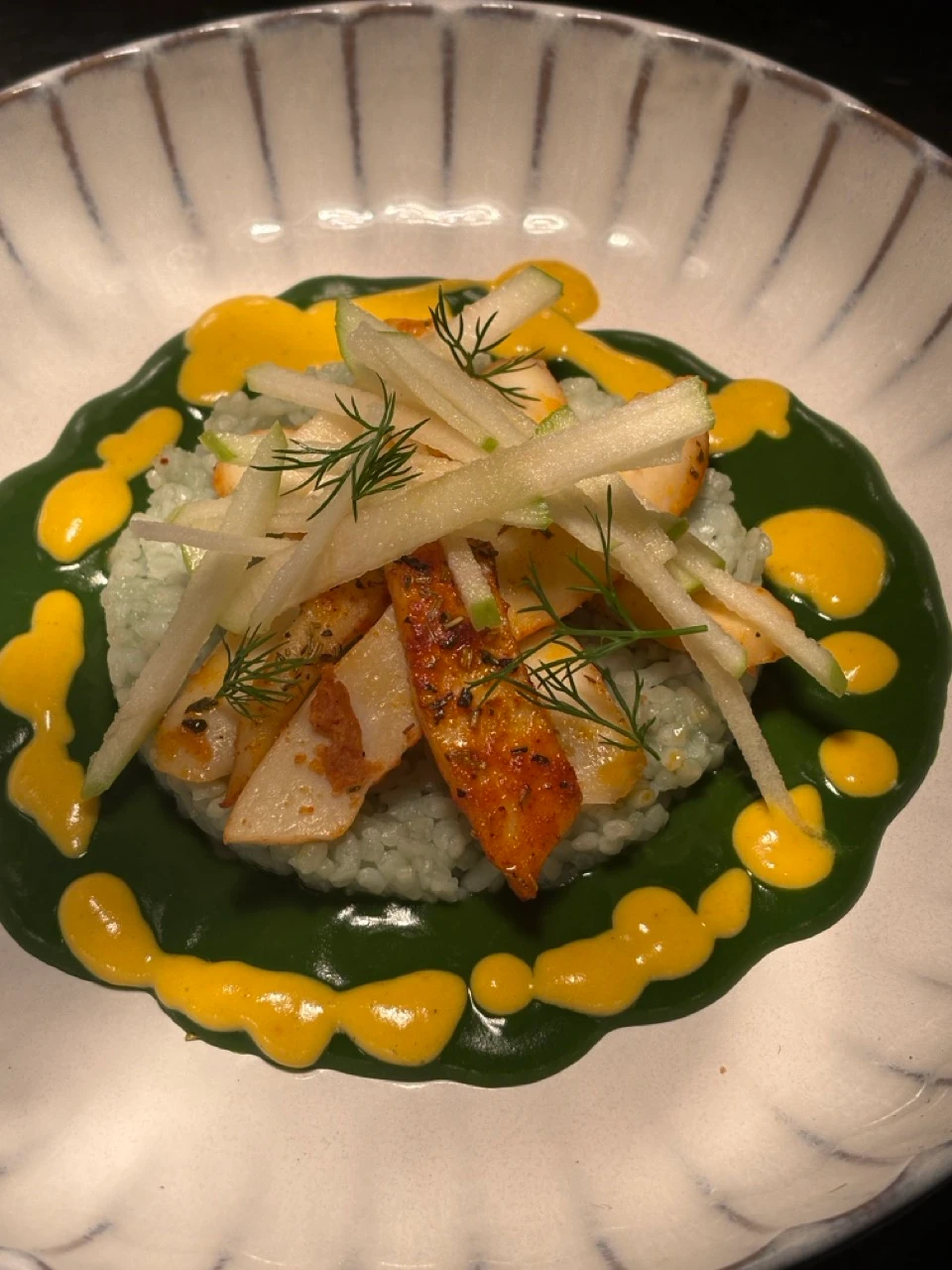 Encornets poêlés, riz bambou, granny smith et crémeux de persil